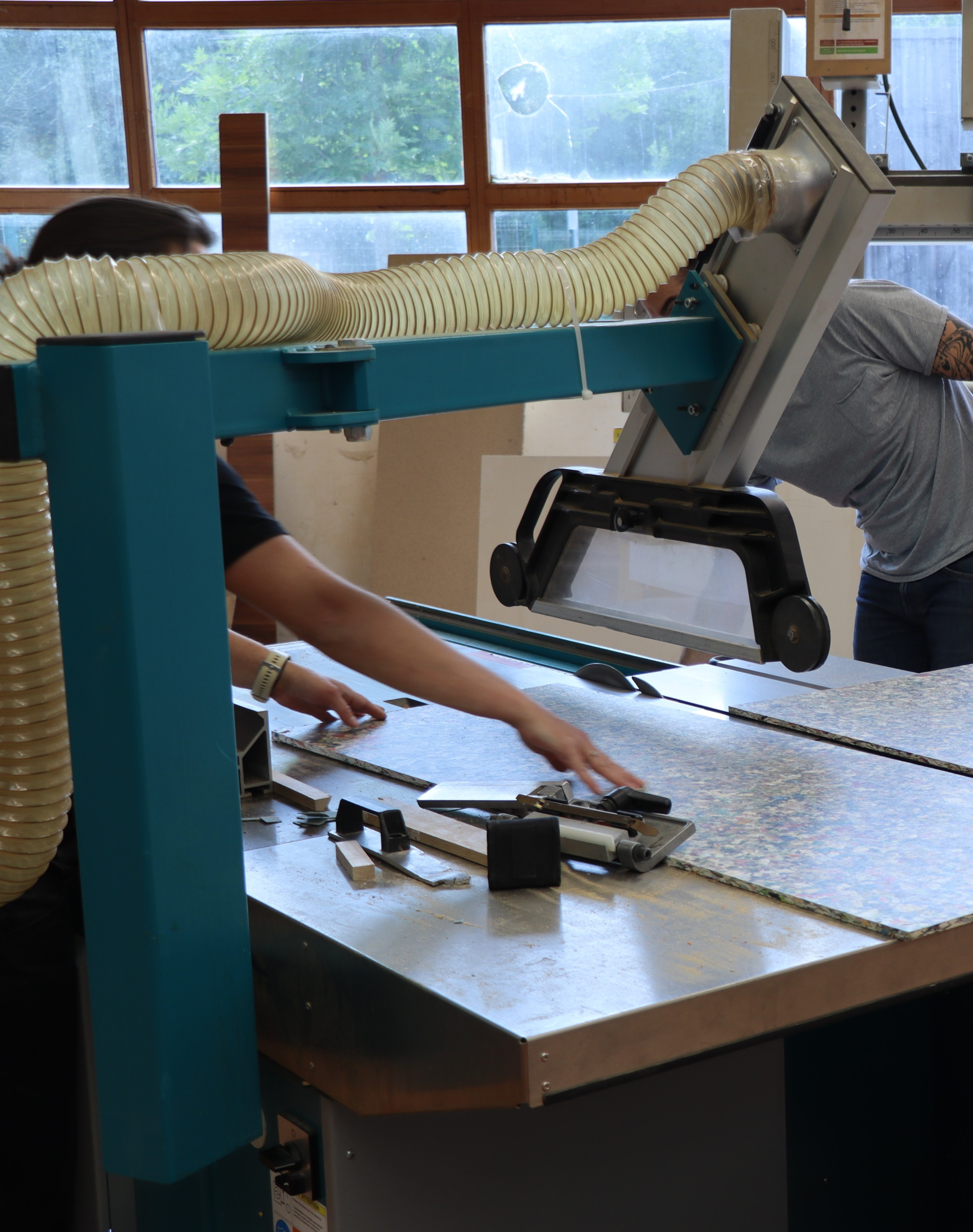 Pour relever ces défis, un important travail de recherche et d’ingénierie a été mené. L’équipe du projet CEO avec l’appui d’une ingénieure spécialiste des process de production, s’est intéressée aux machines adaptées au surcyclage — scies, ponceuses, presses, postes de nettoyage, stations de diagnostic — mais également à l’organisation globale de la ligne de production.