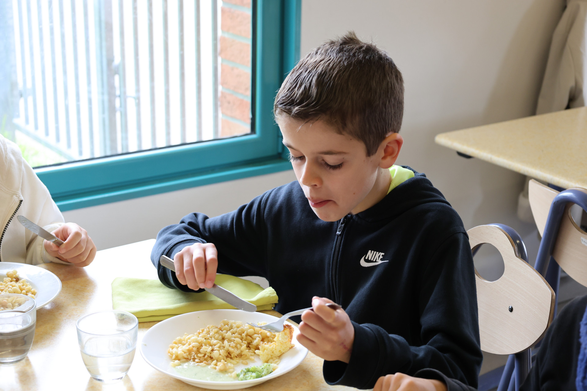 « Pour savoir si on aime un aliment, il faut le goûter 10 fois. Alors ce midi, si vous gouter tous les aliments de votre plat, vous aurez droit à un tampon. Si vous mangez toute votre assiette, vous pourrez demander un second tampon. » Les élèves sont prêts à relever le défi, même les plus difficiles. Chacun goûte la purée de brocolis, l’omelette… Certains vont même se resservir. « L’objectif est aussi qu’ils mangent à leur faim alors ils peuvent demander une petite ou une grande assiette. »