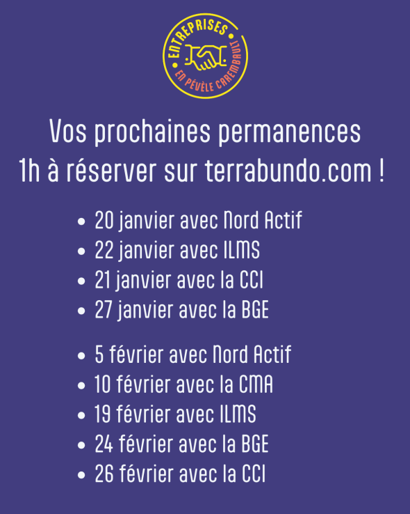 Bénéficiez chaque mois d’1h d’accompagnement gratuit, près de chez vous, avec les experts de la Chambre des Métiers et de l’Artisanat Hauts-de-France, Nord Actif, la Chambre des Métiers et de l’Industrie Hauts de France, la BGE Hauts-de-France, Impulsions Métropole Sud ou encore le Réseau Initiative Lille Métropole Sud.