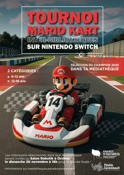 Vos enfants et ados ont l'âme d'un compétiteur ? Ils adorent Mario Kart ? Inscrivez les au concours de jeu vidéo organisé par Pévèle Carembault dans les médiathèques du réseau Graines de Culture(S).