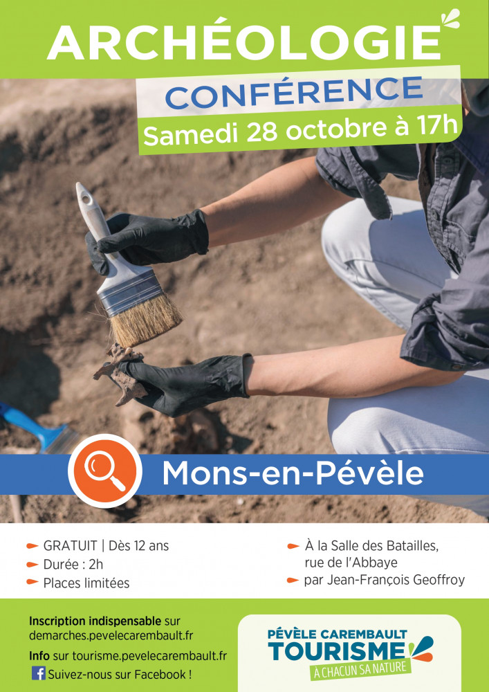 Le samedi 28 octobre, à 17h, à la Salle des Batailles de Mons-en-Pévèle, Jean-François Geoffroy, originaire de notre territoire, animera une conférence sur l'archéologie. Elle est proposée par l’Office de Tourisme Pévèle Carembault. Dans un premier temps, l’archéologue, et ambassadeur de l’Office de Tourisme, détaillera son fascinant métier. Puis, il présentera ce que signifie le mot « archéologie » en France. Enfin, il vous dévoilera quelques-unes des découvertes réalisées sur notre beau territoire. A la fin de la rencontre, l’expert restera disponible pour répondre à vos questions.
