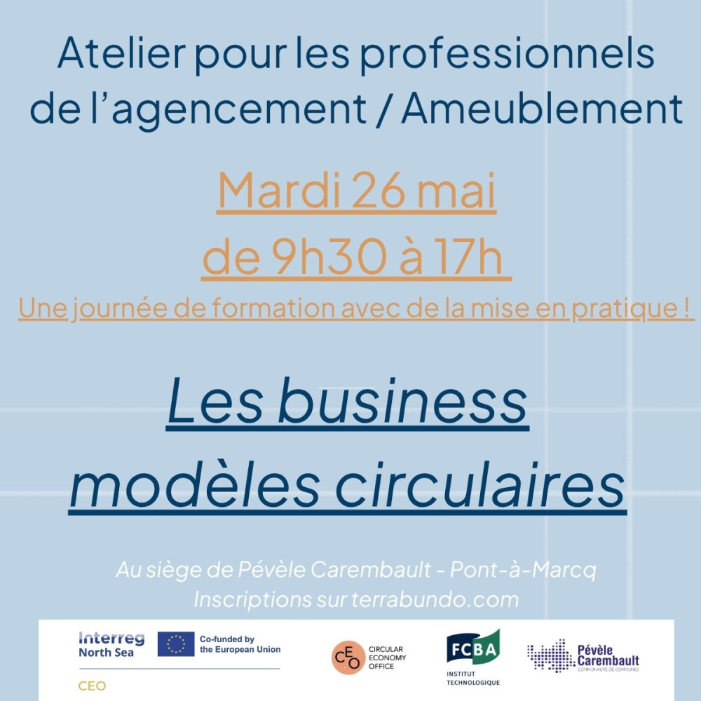 Dans le cadre du programme européen Interreg CEO – Vers l’agencement circulaire, Pévèle Carembault et le FCBA (Institut technologique Forêt Cellulose Bois-Construction Ameublement) vous proposent un atelier professionnel dédié aux modèles économiques circulaires. Une occasion privilégiée pour repenser vos modèles économiques et intégrer des stratégies durables et innovantes au cœur de votre activité.
