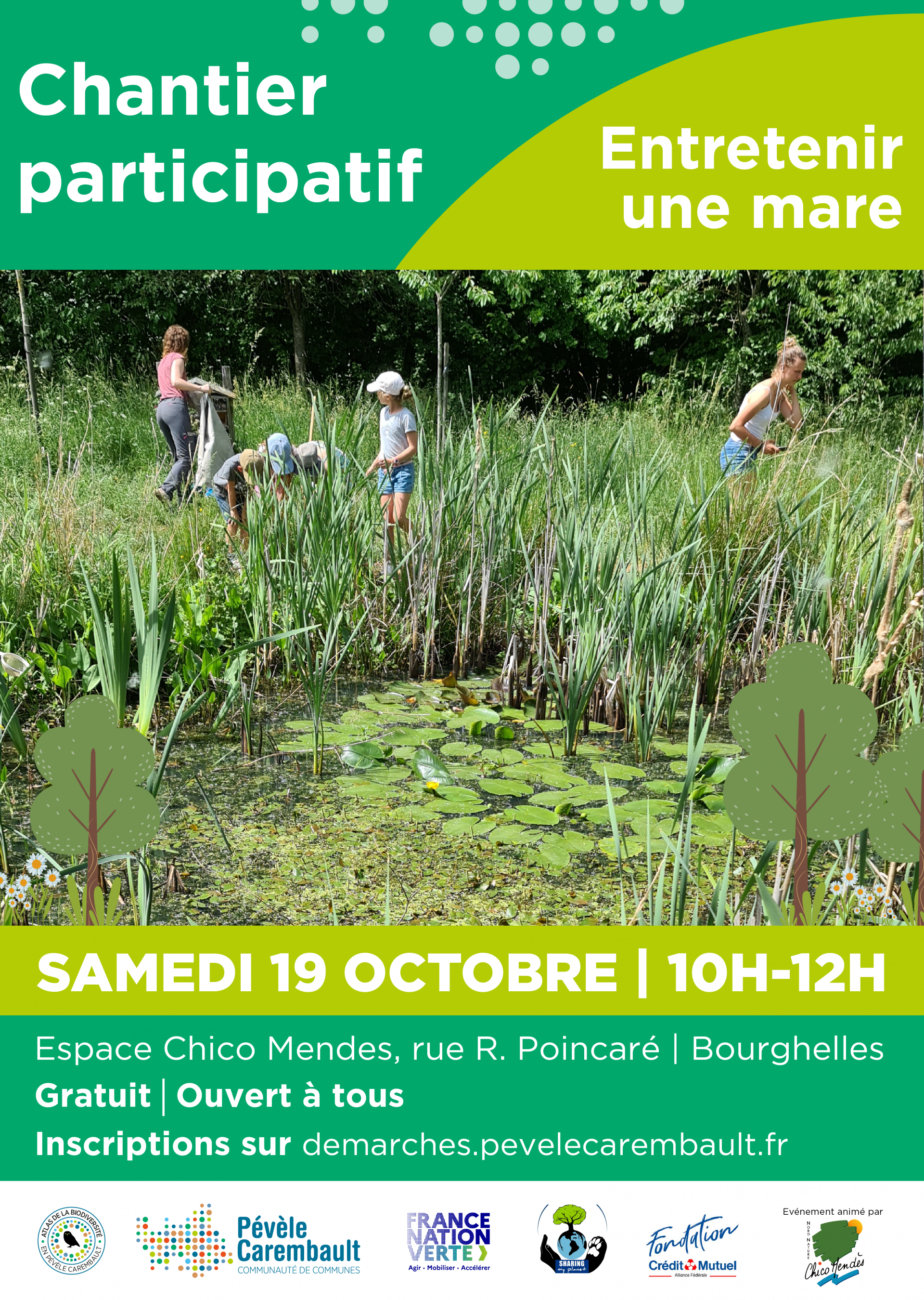 Dans ce cadre, participez à un chantier participatif pour l'entretien de la mare de Bourghelles organisé par l'association Nord Chico Mendes, le samedi 19 Octobre de 10h à 12h.