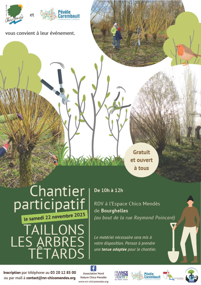Le samedi 22 novembre, l'association Nord Nature Chico Mendès organise un chantier participatif à Bourghelles pour apprendre à tailler des arbres en "Têtards".