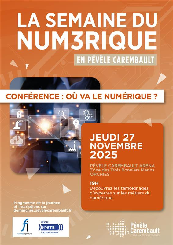 Jeudi 27 novembre, participez à la conférence " Où va le numérique ?" à la Pévèle Carembault Arena à Orchies. Les femmes sont de plus en plus nombreuses à travailler dans les métiers du numérique. Pourquoi pas vous ? Découvrez le témoignage d’entrepreneures qui ont franchi le pas et échangez sur leur parcours. C'est de 19h à 20h30.