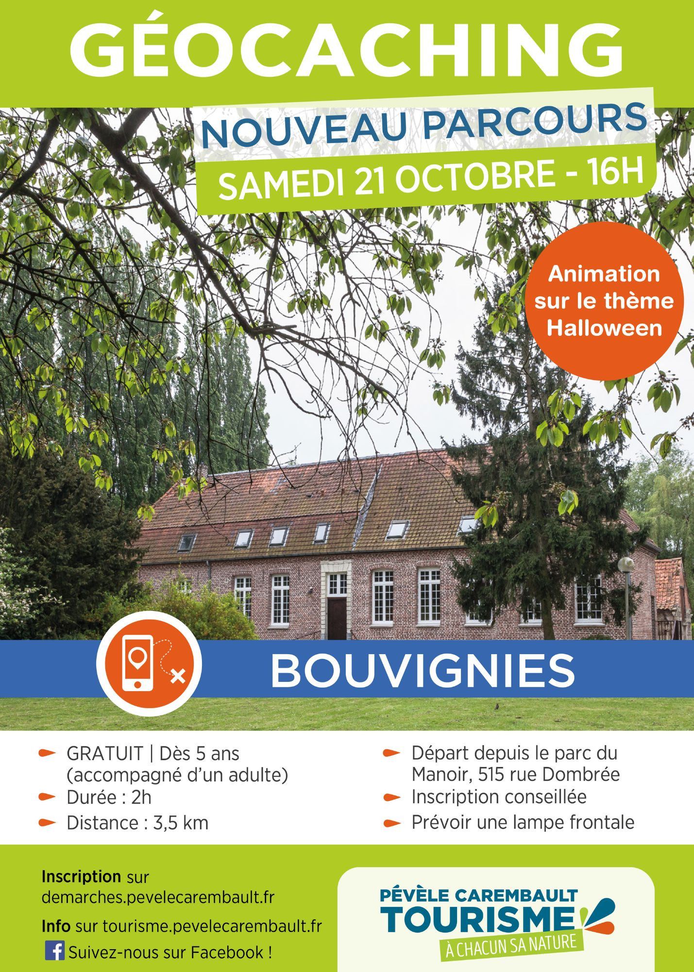 Le samedi 21 octobre, partez à la découverte de Bouvignies lors du lancement officiel d'un circuit de géocaching. Sur les 3,5 kilomètres de parcours, vous devrez trouver 12 boites cachées (aussi appelées géocaches) de différentes formes et tailles. A l’intérieur se trouve un papier (aussi appelé logbook) sur lequel vous devrez inscrire la date et votre nom. Ce sera la preuve de votre passage.